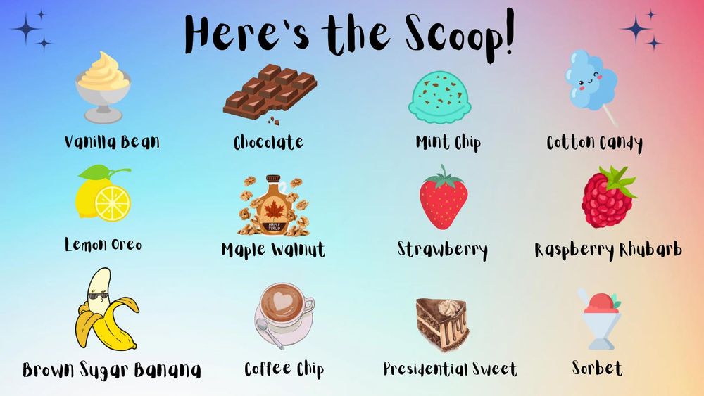 Choose a Flavor: OneVanilla Ice Cream, Chocolate Ice Cream, Strawberry Ice Cream, Marshmallow Ice Cream, Mint Ice Cream